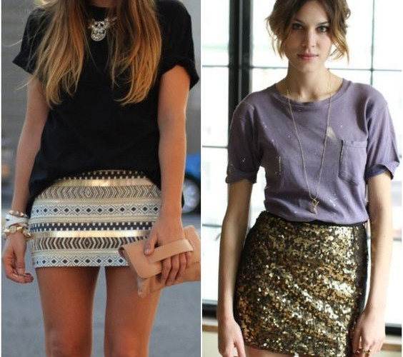 Um dos jeitos mais fáceis de transformar um look dia em um look noite é usar uma fórmula simples: camisetas básicas + peças de baixo feitas de tecidos nobre + acessório bacana (como brincos maxis ou colares e pulseiras de várias camadas.